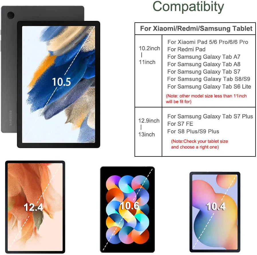 لأجهزة iPad Pro 11 بوصة 2024، iPad Air 11 بوصة 2024، iPad Air/ 2 /3 / 3 Pro/4/ 5، iPad Pro 10.5 2017، iPad Pro 11 بوصة iPad 4th/ 5th/ 6th، iPad 7th /8th /9th 10.2، iPad 10th 10.9، Xiaomi Pad 5/Pro / Pad 6/Pro 11 بوصة/ Redmi Pad/ Redmi Pad SE 2023, Samsung Galaxy Tab A7 /A8 /S7 /S8/S9/ S9 FE/S6 Lite, Lenovo Tab M10 FHD Plus
