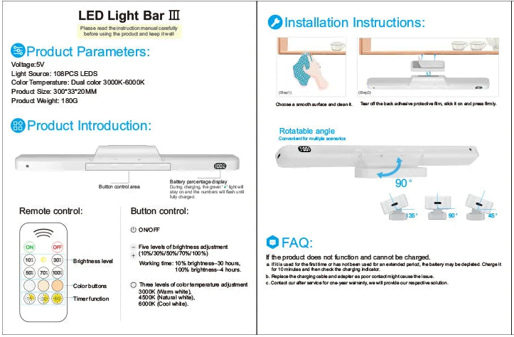 Color Temperature: Adjust for three levels: 3000K (warm white), 4500K (natural white), 6000K (cool white).